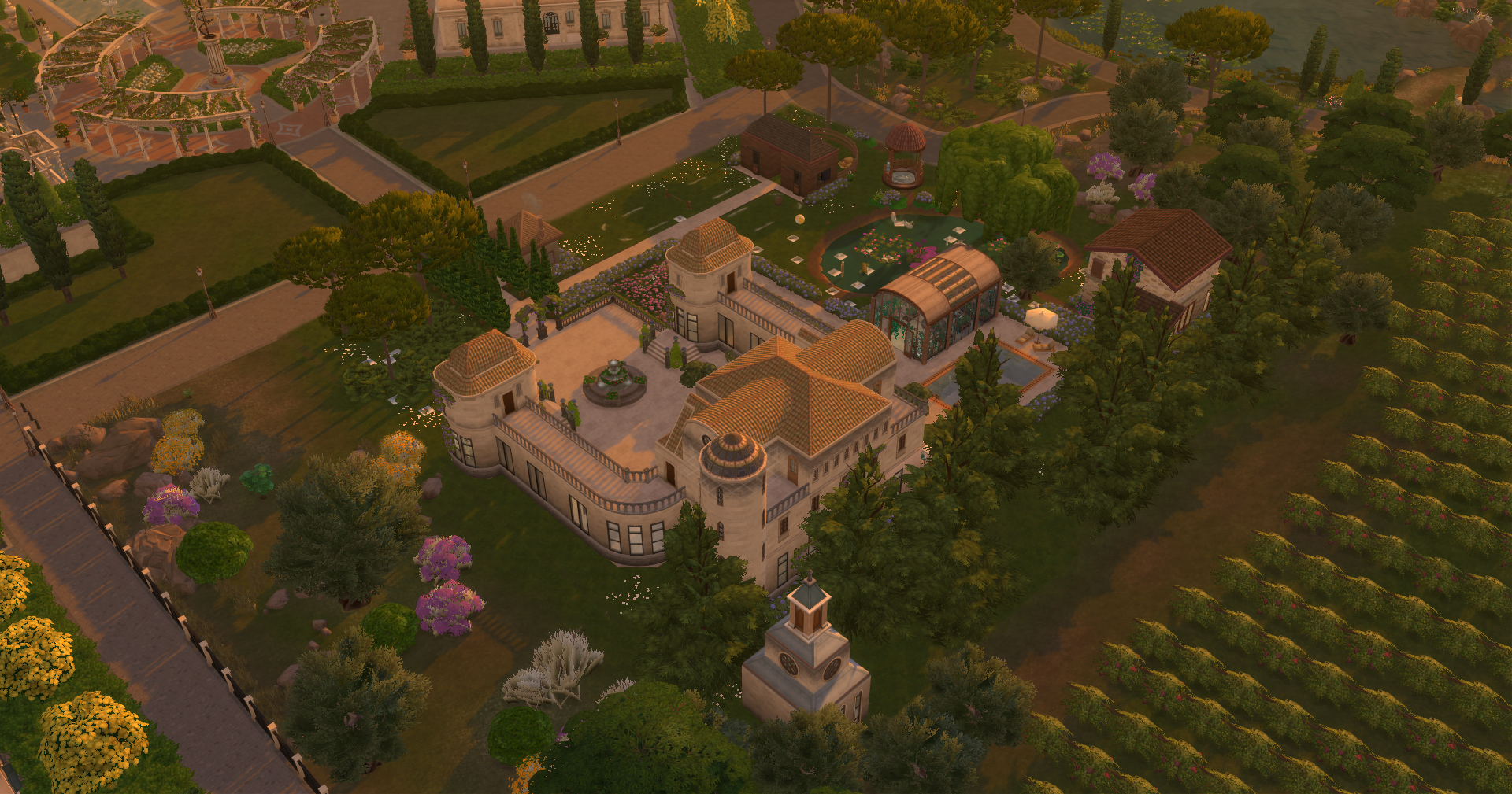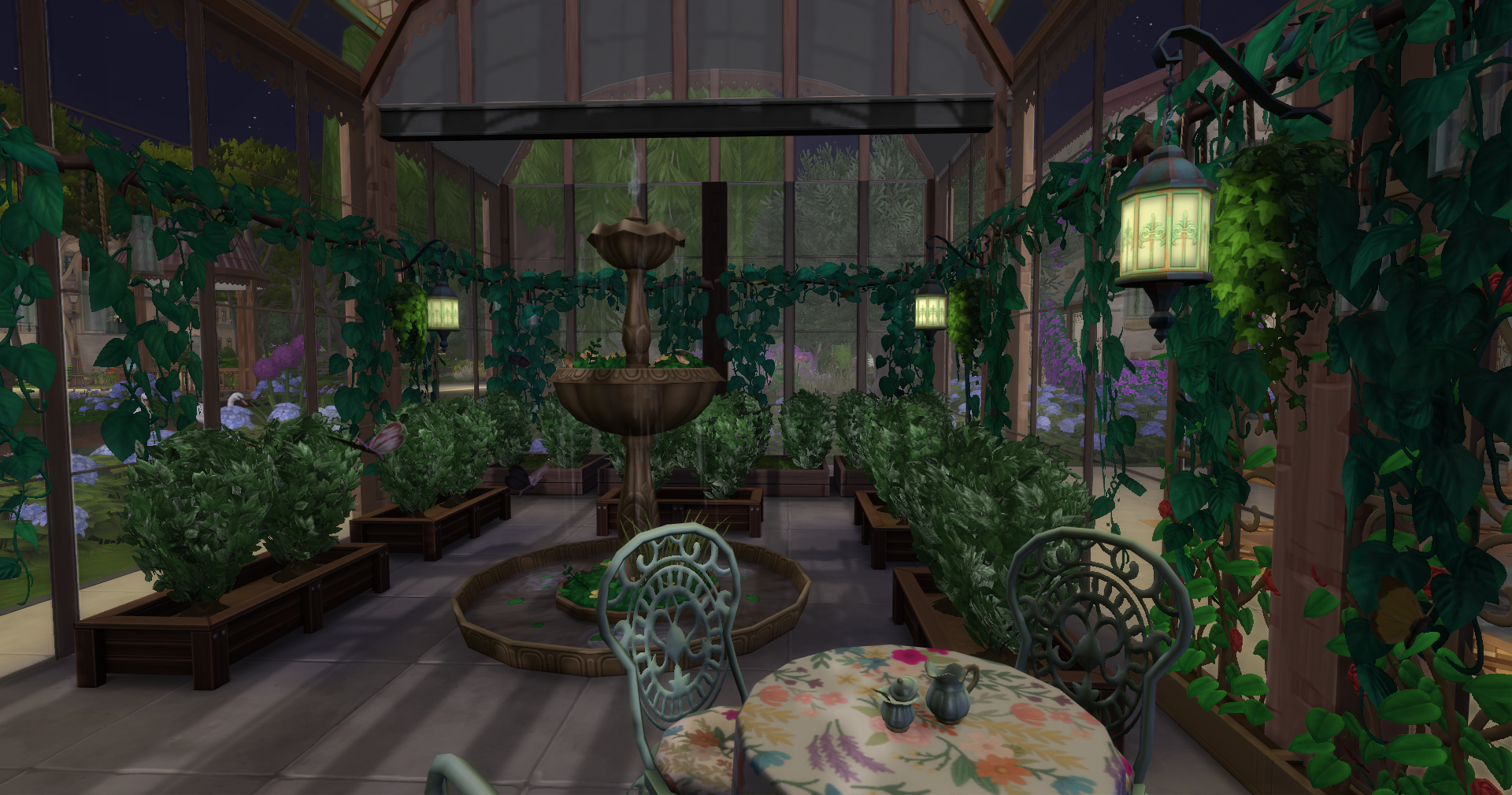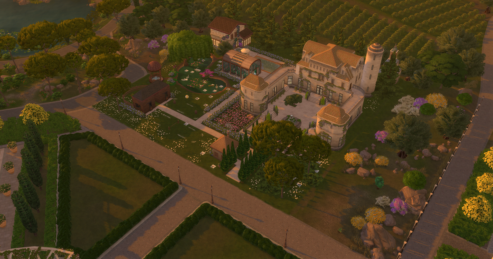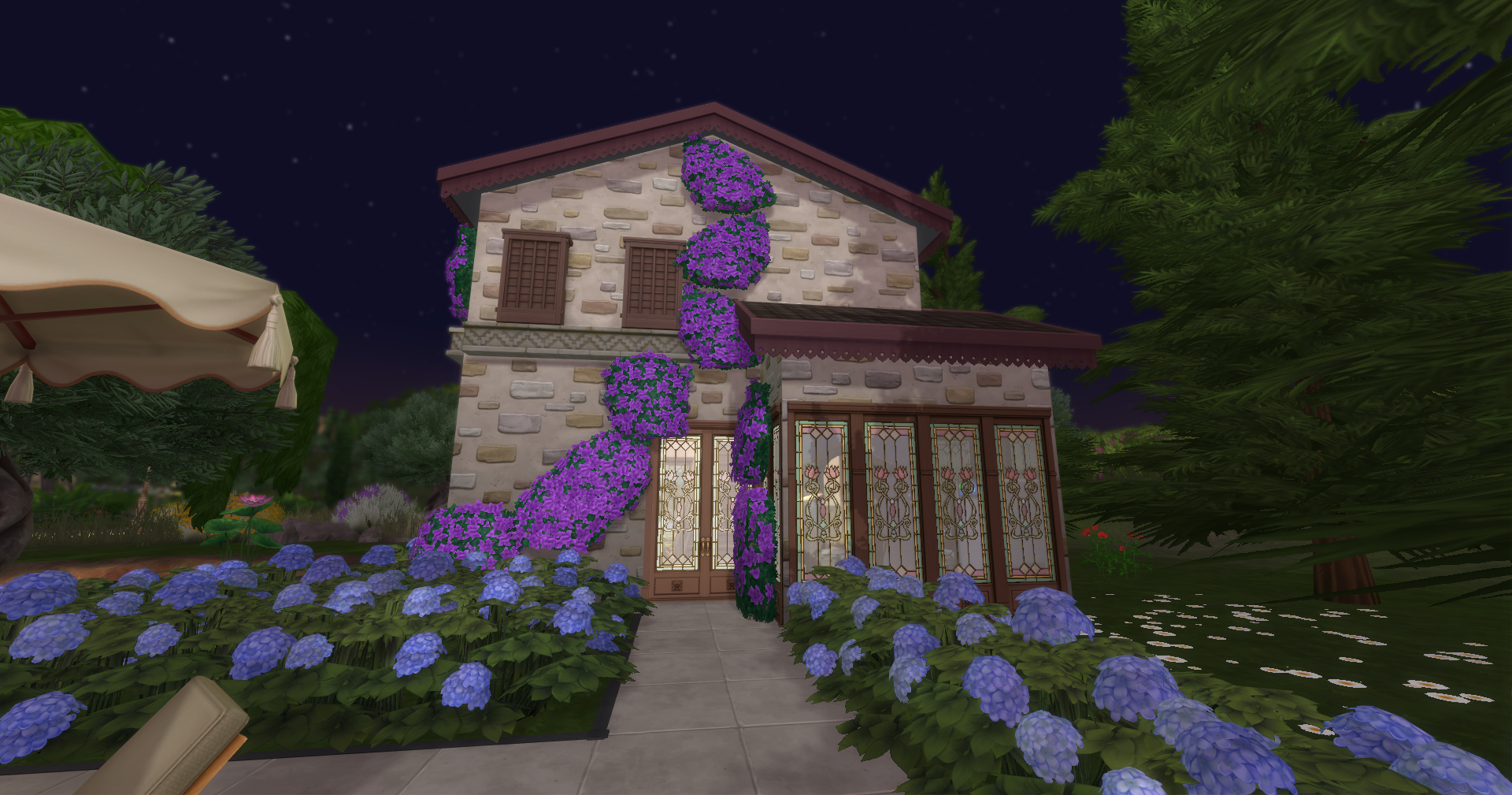 Autour du bâtiment principal se trouvent une serre dédiée aux fraises et aux papillons, une maison pour accueillir les invitées et une écurie.