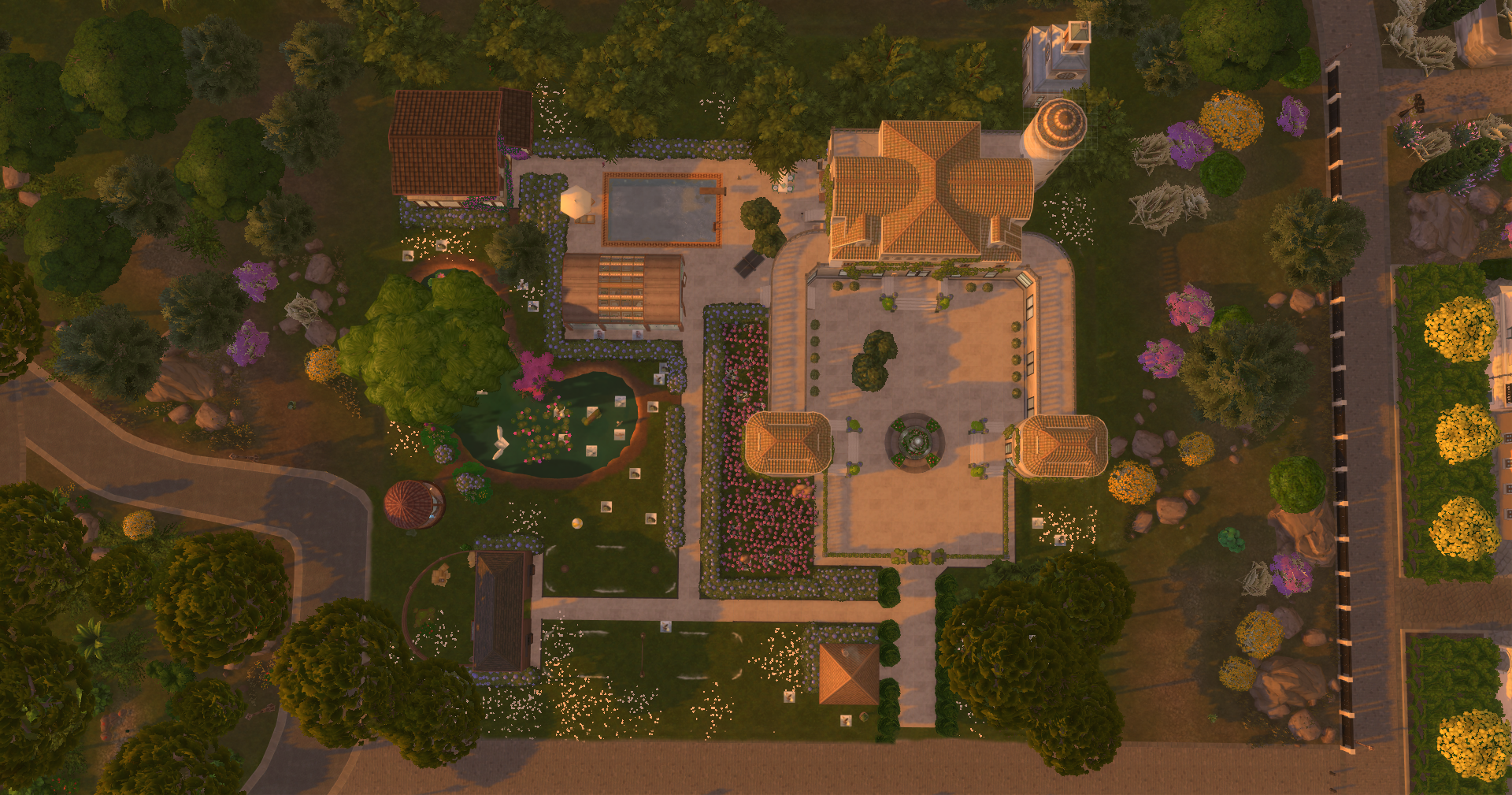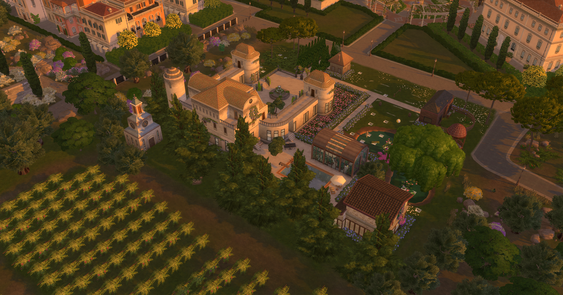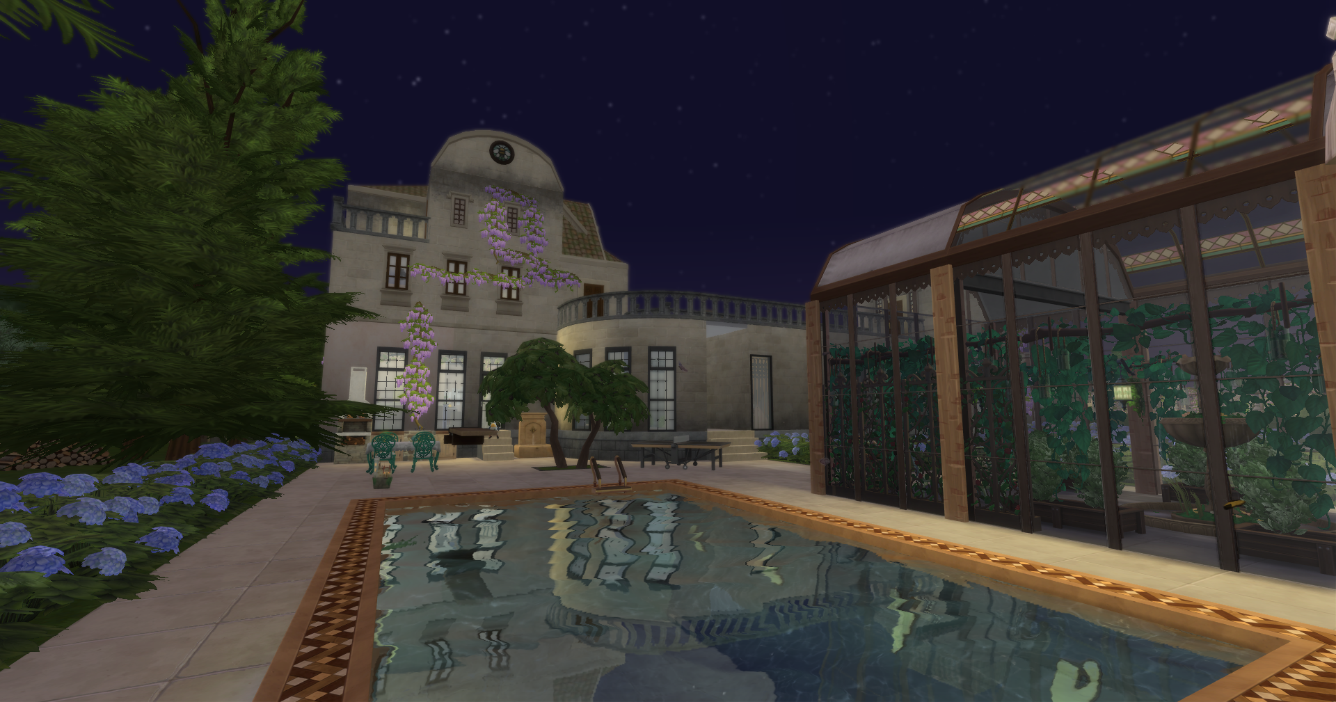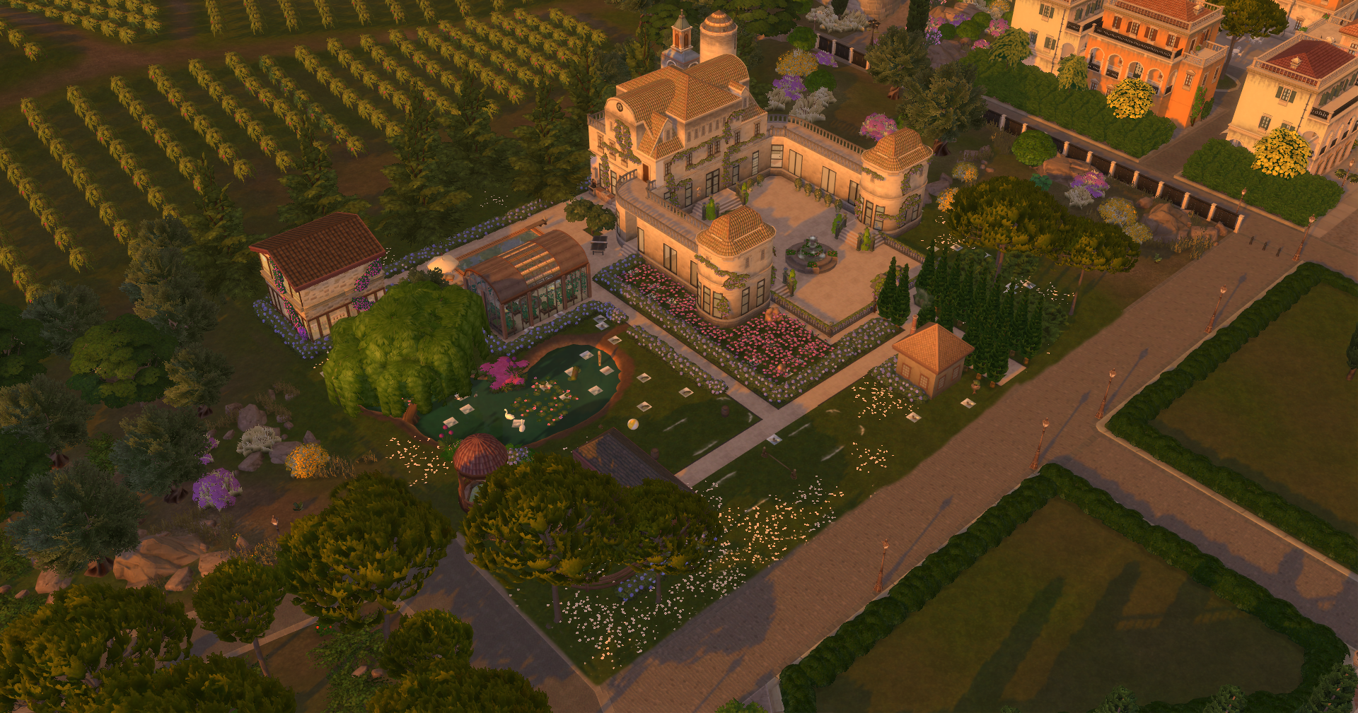 Autour du bâtiment principal se trouvent une serre dédiée aux fraises et aux papillons, une maison pour accueillir les invitées et une écurie.